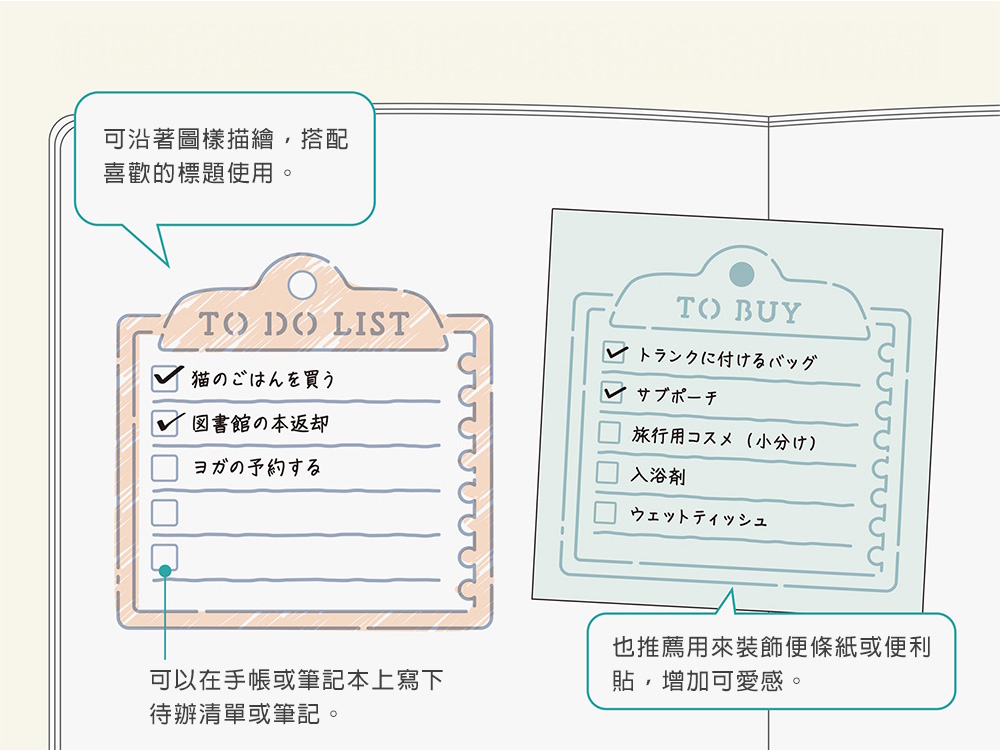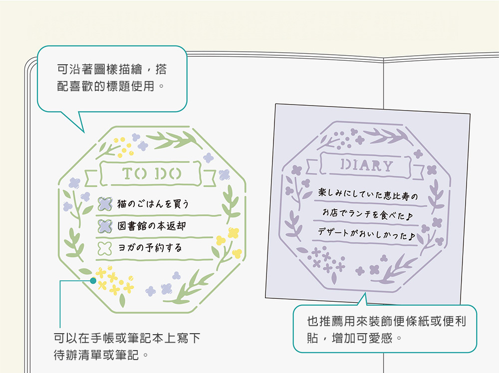 各位朋友透過這個描圖板,真輕鬆就可以為手帳增加趣味、實用的圖案!